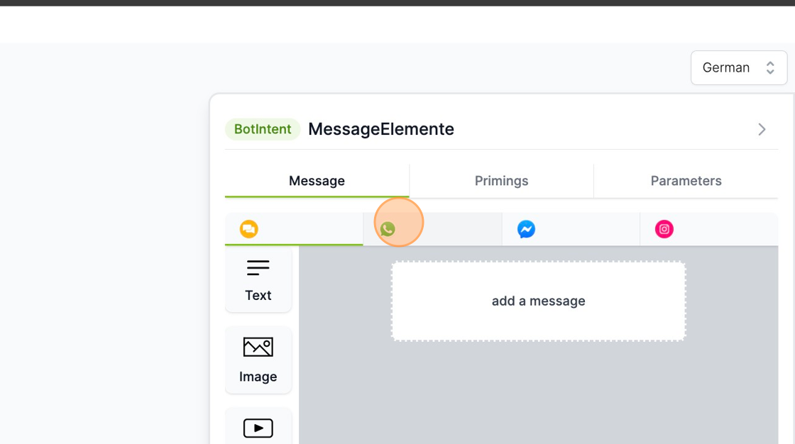 5. Unter Messages legt man die Botnachrichten an. Nachrichten für den Webchannel legt man unter dem gelben icon an, Nachrichten für WhatsApp unter dem grünen Icon, für den Facebook Messenger bewegt man sich zu dem blauen icon und Instagram Messages werden unter dem pinken icon angelegt.