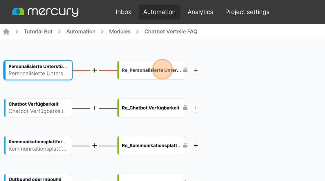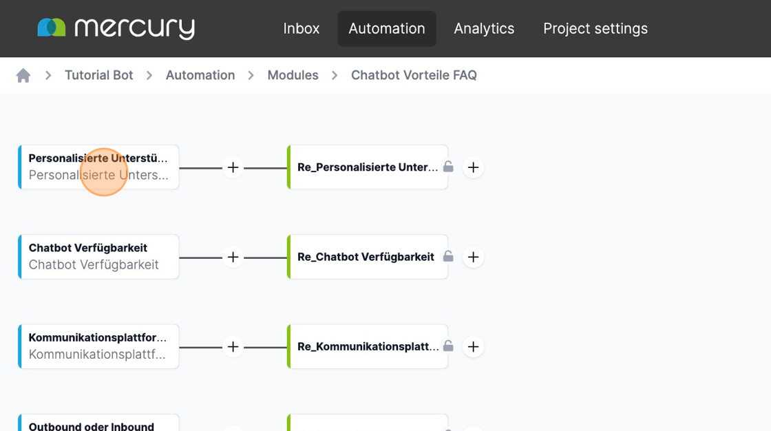 3. Zunächst legen wir einen Namen für das Modul fest, in unserem Fall nennen wir das Modul „Chatbot Vorteile Faq“
